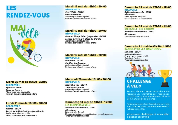 Mardi 05 mai de 16h00 - 20h00 REPAR’VÉLO Épernon- 28230 Place de la gare Lundi 11 mai de 16h00 - 20h00 REPAR’VÉLO Pierres - 28130 Parvis de la Mairie - Place Jean Moulin Mardi 12 mai de 16h00 - 20h00 RÉPAR’VÉLO CHATENAY - 28700 9 rue du Moulin Mardi 19 mai de 16h00 - 20h00 RÉPAR’VÉLO Auneau Bleury Saint-Symphorien - 28700 Espace Dagron, 2-4 place du Marché