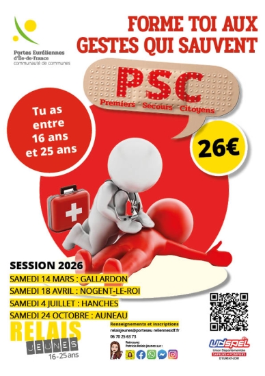 Depuis plusieurs années, le Relais jeunes organise des formations de Prévention Secours Civique de niveau 1 (PSC1).La communauté de communes participe au financement de cette formation d’utilité publique qui a pour objectif de faire de tout citoyen le premier maillon d’une chaîne de secours en formant aux gestes qui sauvent.CALENDRIER DES FORMATIONSNouvelles dates pour se former aux gestes qui sauvent. Réservé aux jeunes de 16 à 25 ans de la communauté de communes des Portes Euréliennes d’Île-de-France.Autres dates à venir10 places par session InscriptionFiche d'inscription Patricia Buse : 06.70.25.63.73relaisjeunes@porteseureliennesidf.fr