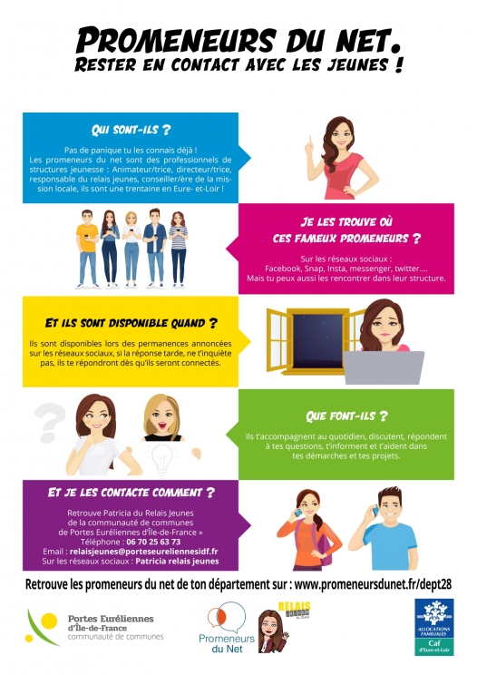 Informer, maintenir le lien, écouter, conseiller, soutenir : les Promeneurs du Net, c’est une autre manière d’être en relation avec les jeunes. Le relais jeunes est présent sur les réseaux sociaux : Instagram, Snapchat, Facebook, Messenger et Whatsapp.Découvrez l'univers des Promeneurs du Net avec la vidéo ci-contre.Pour plus d'information : www.promeneursdunet.frou contacter :Patricia Buse : 06.70.25.63.73 relaisjeunes@porteseureliennesidf.fr