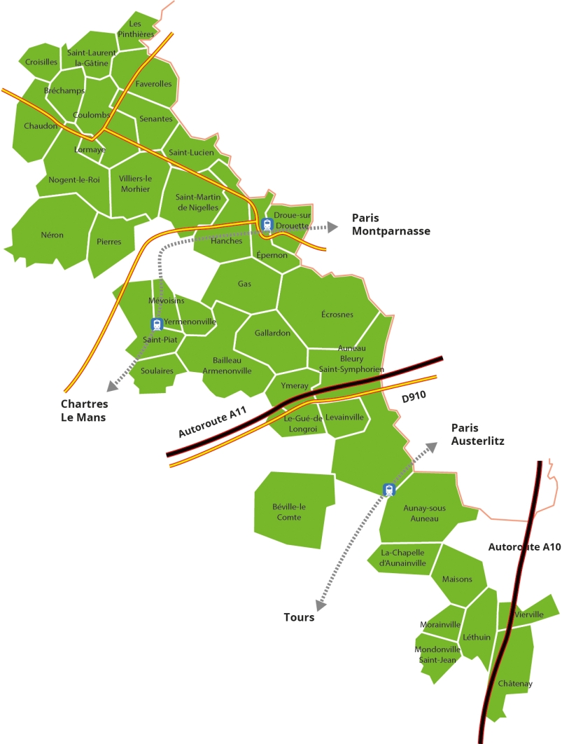Nos 39 communes :Cliquez sur le nom de la communes pour accéder à son site internetAunay-sous-Auneau Auneau-Bleury-Saint-SymphorienBailleau-Armenonville Béville-le-Comte Bréchamps La Chapelle-d’Aunainville Châtenay Chaudon Coulombs Croisilles Droue-sur-Drouette Écrosnes Épernon Faverolles Gallardon Gas Le Gué-de-Longroi Hanches Léthuin Levainville Lormaye Maisons Mévoisins Mondonville-Saint-Jean Morainville Néron Nogent-le-Roi Pierres Les Pinthières Saint-Laurent-la-Gâtine Saint-Lucien Saint-Martin-de-Nigelles Saint-Piat Senantes Soulaires Vierville Villiers-le-Morhier Yermenonville Ymeray