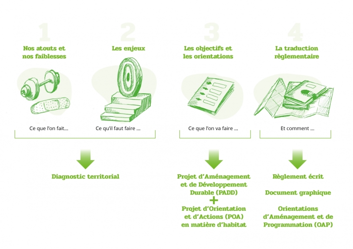 - Le Projet d’Aménagement et de Développement Durables (PADD), document stratégique qui traduit le projet du territoire et fixe les grandes orientations d’aménagement, de développement et d’habitat pour les 10 à 15 prochaines années.